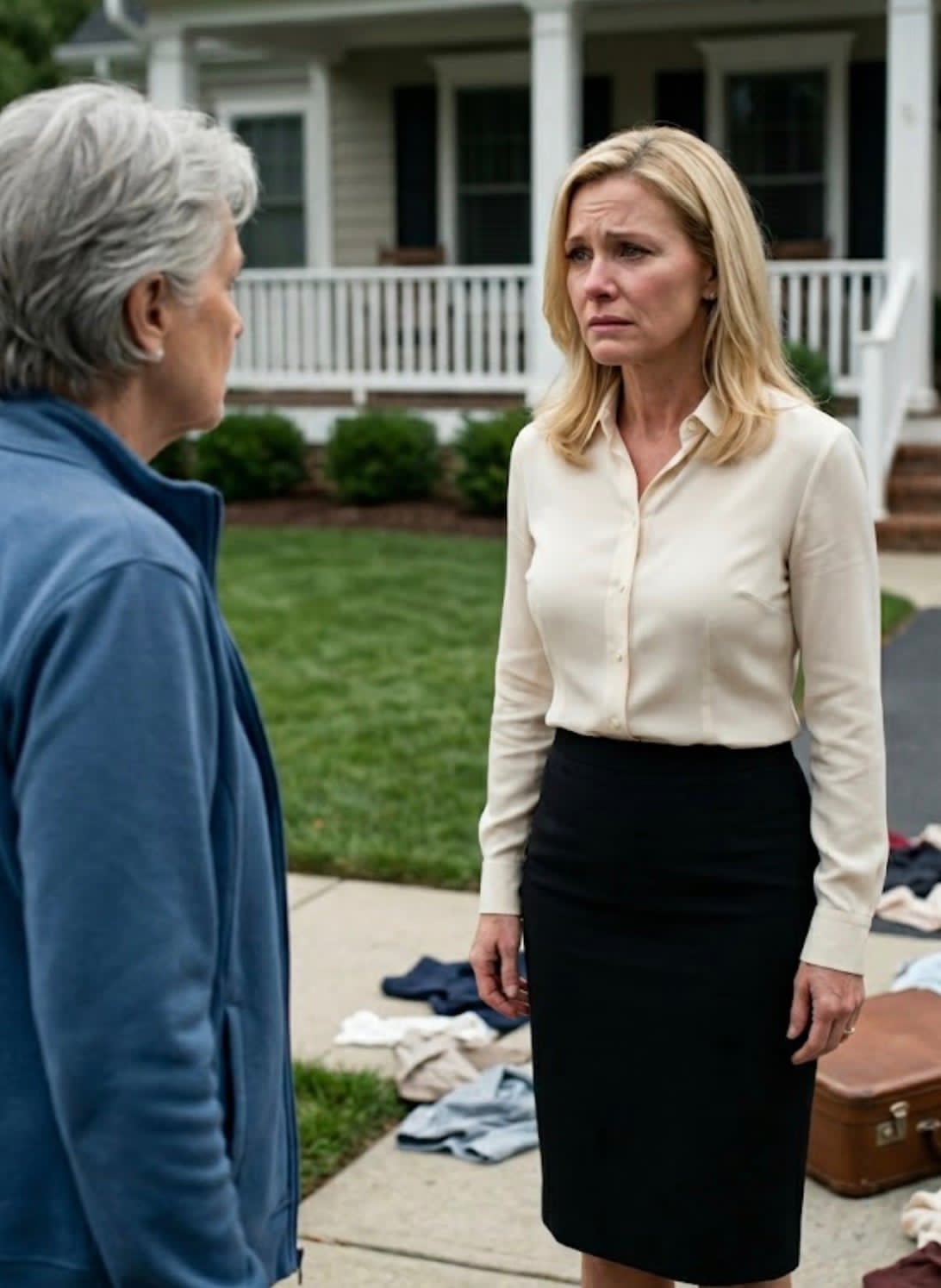 К полудню, когда к дому стали подъезжать машины — слухи разлетелись по району — Белль постучала в мою дверь. “Собирайся. Мы уезжаем. Ты не поедешь.” Потом она заговорила о доме престарелых, будто бронировала столик. Я едва успела вдохнуть, как шкаф распахнули. Моя одежда, свадебное фото, дорогие вещи — всё выкинули прямо в окно. Фарфор разбился на улице. Соседи наблюдали. Мейсон стоял рядом, белый как лист, рот открывался и закрывался.